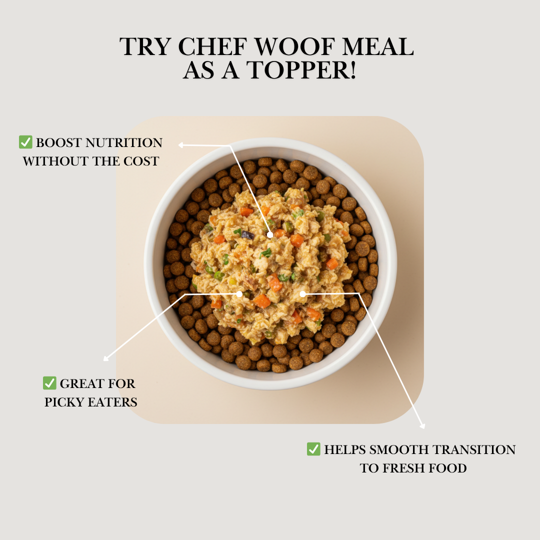 Add just a scoop of Chef Woof meal on top of your dog’s regular kibble — and instantly boost nutrition, flavor, and happiness! Perfect for picky eaters and a great way to ease the switch to fresh food.